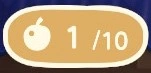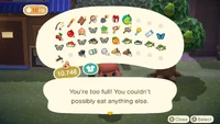 In New Horizons, eating one fruit gains the histrion a temporary ability to shovel a fully-grown tree or to suspension a rock. A counter appears on the upper-left screen showing how much fruit the player has eaten. The player can consume at most 10 fruit until a speech bubble appears telling the player, "You're as well total! You couldn't possibly eat anything else." The number decreases by ane for every tree the player digs up or for every stone the player breaks.
